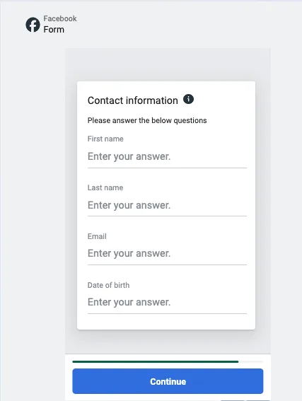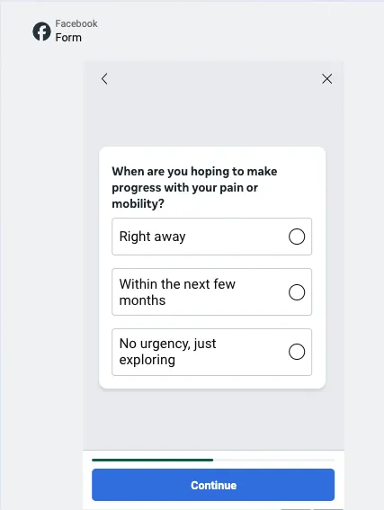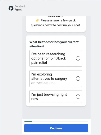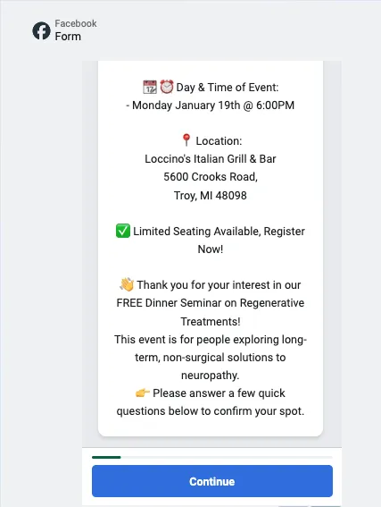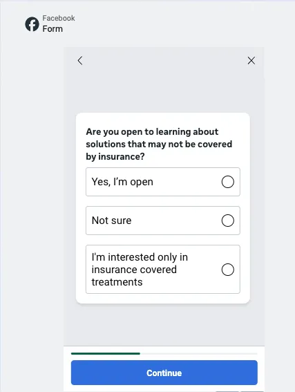 “The screenshots below show the complete Facebook Instant Lead Form as presented to users, including the call-to-action, form questions, SMS disclosure, consent language, and submission step.”